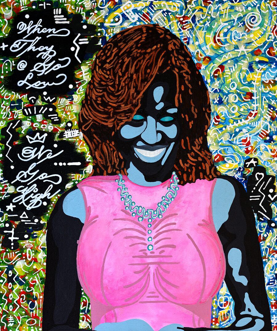 Artists’ Insights: Inspired by the words of Michelle Obama, “When they go low, we go high” I wanted to create an image that spoke volumes to who she is and her commitment to excellence. I also wanted to create an image that honors the confidence of Black women and the joy in knowing self. She wears her a characteristic style fitted designer pink dress, an elegant blue pearl necklace and matching eyeliner, bringing her radiating confidence and grace to the canvas. I gave her the biggest smile because, in life, black women have learned to shrug off negativity. This simple yet elegant classical composition, conveys power as she stands with her head slightly bowed, eyes closed, and a big smile on her face.