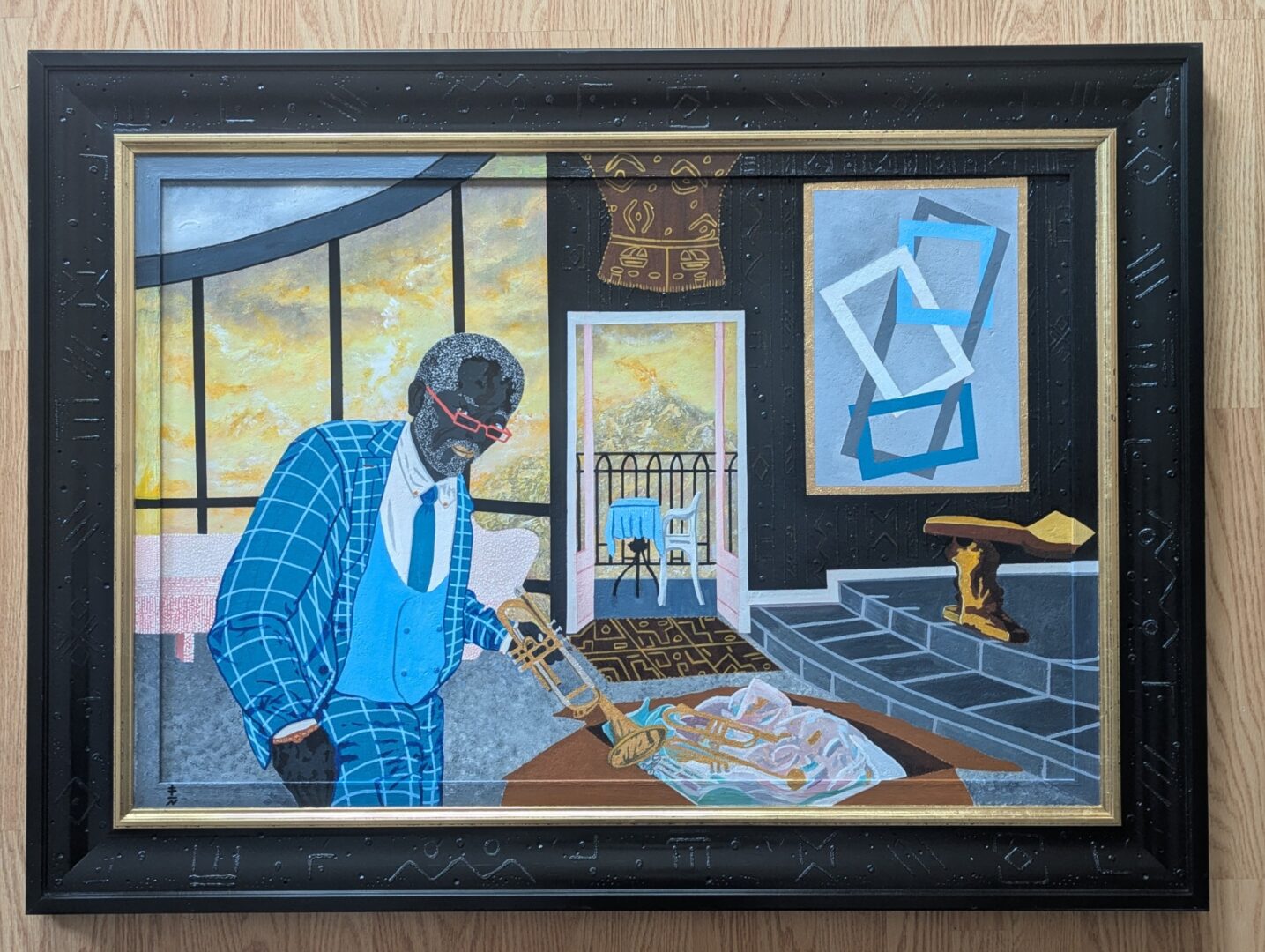 Artists’ Insights: This painting tells the story of an elderly gentleman that reunites with his first love, the trumpet. We join him standing in his living room after coming in from the terrace looking out on Mount Rainier. You can feel the afternoon sun filling the room with warm light glistening through the big bay windows. The richness of African culture adorns the walls with tapestries and fine art. Dressed in a new bespoke suit for the dinner party later tonight, he finds himself overwhelmed with excitement to open a gift that arrived earlier. To his surprise, he finds his childhood friend, the trumpet… and many others. Do you think he will play for his guests when they arrive tonight?